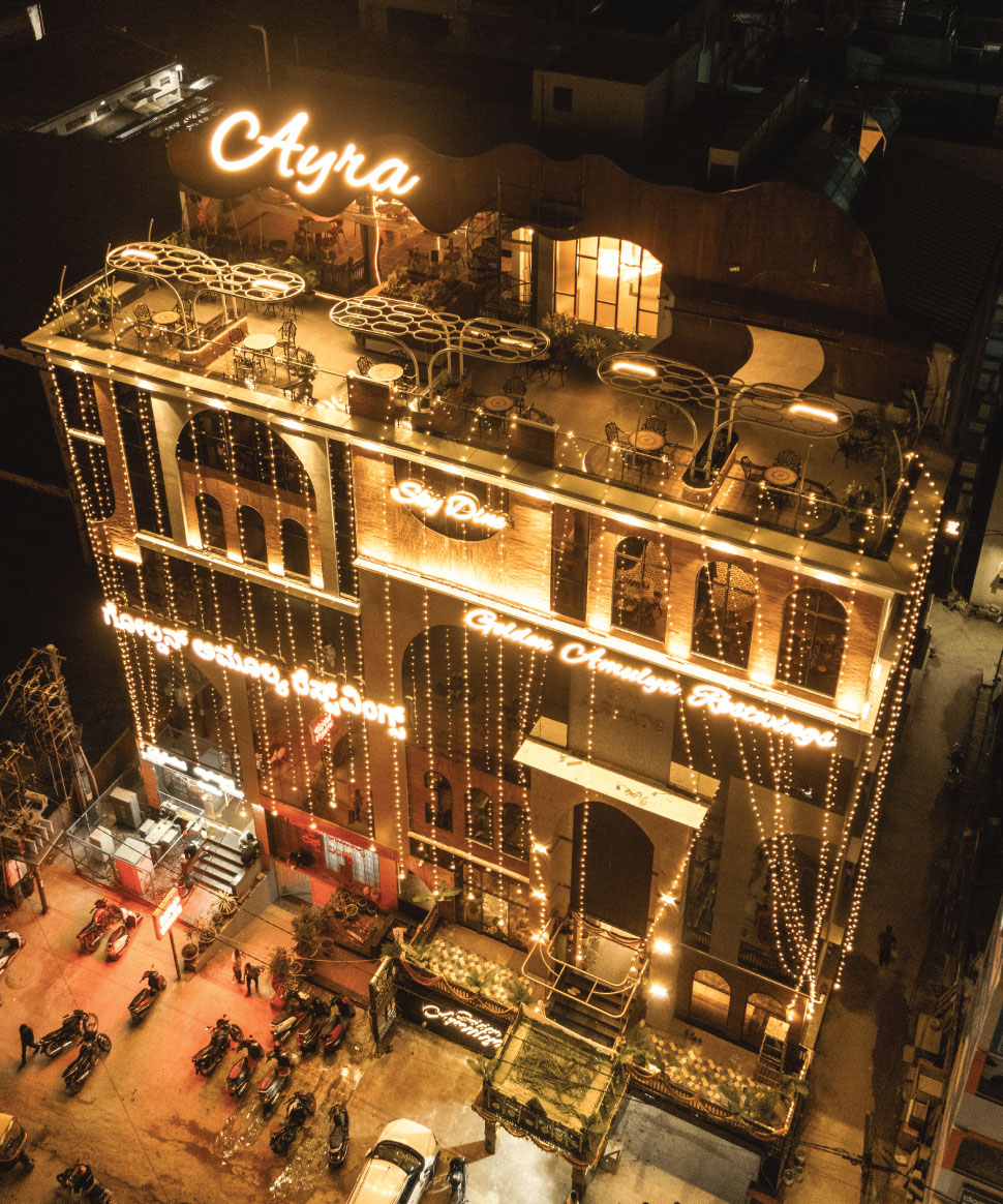 Ayra offers stunning skyline views, warm ambient lighting, and a stylish open-roof experience that comes alive from 6:30 PM onwards. Designed for relaxation and indulgence, it’s the perfect place to unwind above the city’s bustle.